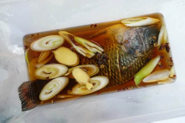 2、拿一个大点的容器放入处理好的鱼,加大葱、生姜、八角.2.颗、花椒一小把、一瓷勺盐,一勺生抽,再加水没过鱼,搅拌均匀放冰箱隔夜腌制。