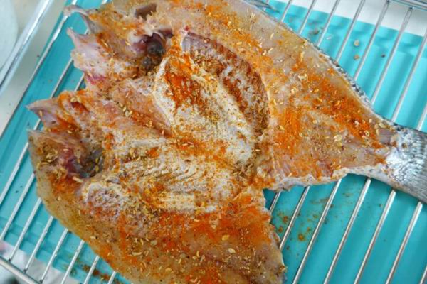 4、鱼的内侧撒上孜然粉、辣椒粉、花椒粉、少量香菜籽粉,再撒点海盐。正面刷点橄榄油。