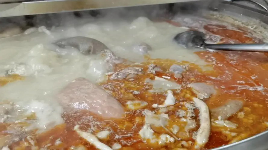 老板打调料,老板娘烫粉,食客自己用大铁勺首汤,如果运气好,碰到煮烂的骨边肉浮在汤面,一起顺到碗里,上学的路上都是乐呵呵的。