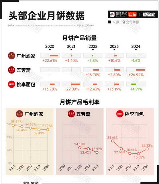 广州酒家的月饼产品维持着超过 50% 的高毛利率,但销量增长已显著放缓;五芳斋则以牺牲利润为代价冲刺销量,其毛利率在三年间从 24.1% 降至 16.92%;桃李面包则呈现出另一种挑战,其销量在 2024 年大幅下滑 14.91%,尽管毛利率有所回升,整体仍面临增长压力。