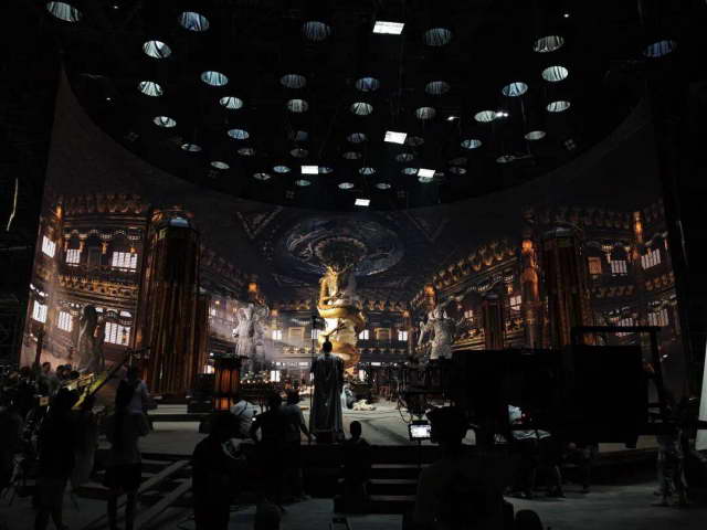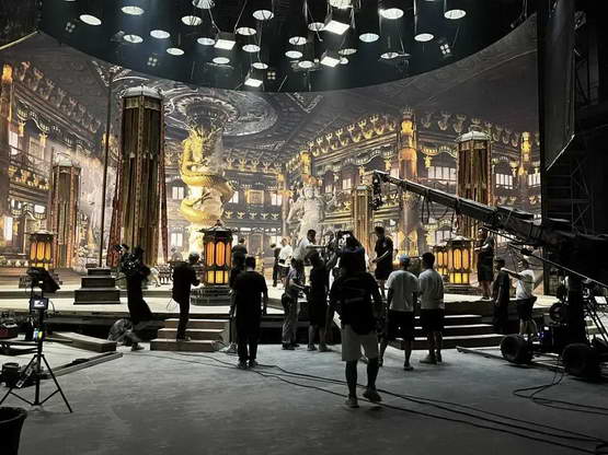 听起来挺玄乎,但说白了就是先把像金龙殿这样的数字资产,用虚拟引擎,比如 Unreal Engine,实时渲染出来,然后再把画面投到 LED 屏幕上。