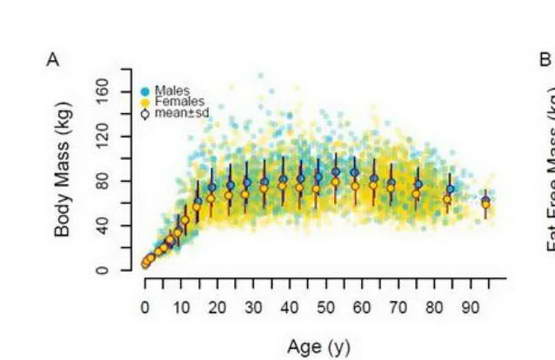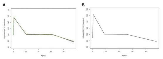 这是研究中调整后的总代谢(图 A)和基础代谢(图 B)随着年龄增长的变化趋势。代谢水平可以分为 4 个阶段。