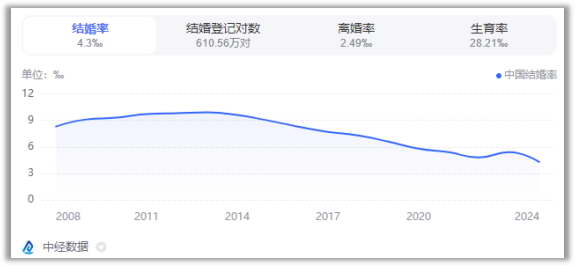 2014 年中国的结婚率是 9.6‰,十年后这个数字变成了 4.3‰。