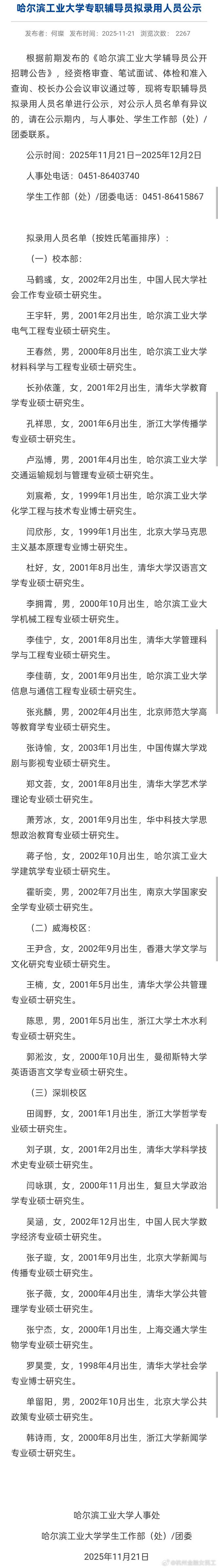 @杭州金融女民工:这是哈尔滨工业大学今年录取的专职辅导员名单。