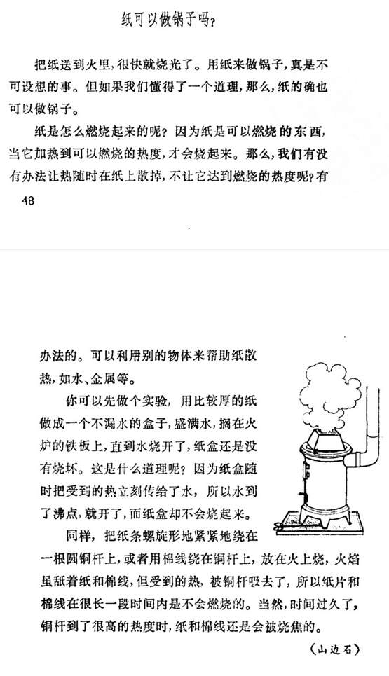 其二,我又要提到儿童读物《十万个为什么》了。在 1980 年出版的《十万个为什么?物理?2》的第 48 页,有一篇《纸可以做锅子吗》。既然纸可以做锅烧水,那么纸也并不易燃吗?