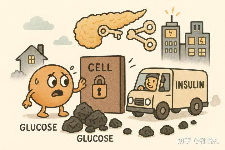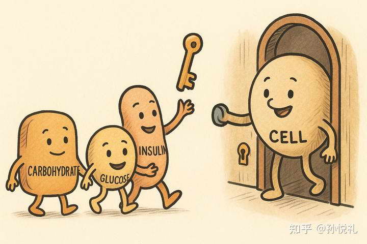 当我们吃进主食或甜食,碳水被分解成葡萄糖(血糖),进入血液。血糖可以供全身细胞使用,但问题在于 —— 细胞门是锁着的,葡萄糖自己进不去。这时胰岛素就像 “开门钥匙” 一样,由胰腺分泌出来,带着葡萄糖去敲细胞的门,说:“来点能量吧!”