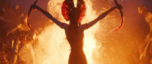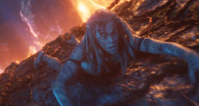 前半段登场敲锣打鼓逮谁灭谁,她们虽然也是纳威人但并不信仰爱娃,因为许多年前族群危机时爱娃没显灵,这种不灵的神仙不信也罢,自愿当异教徒,身体逐渐进化出控制火焰的能力,进攻商队时有场戏,我强烈怀疑卡梅隆借鉴了小日本的神风特攻队。