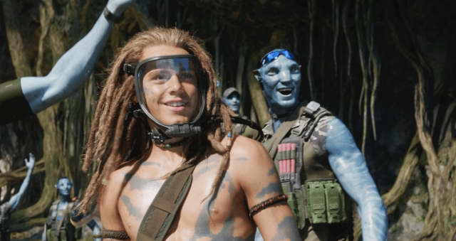第二部《水之道》扩展到海洋,杰克与奈蒂莉组建家庭生了一堆娃(两男一女加养女琪莉),经过相对平静的十年,RDA 卷土重来,这次不光挖矿还要完全占领潘多拉星,森林被摧毁杰克带领族人被迫迁徙到海边的岛礁族领地。
