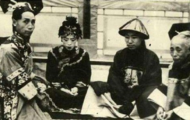 这张照片,记录了一个朝廷官员娶妻的真实现状,新人边上有喜婆的陪同,还有女子的母亲,但是这些人的脸上,似乎少了些笑容,婚礼也是如同现在的中式婚礼一般进行,也有仪式和娶亲过程,只是清朝的时候,女子的身份依然卑微。