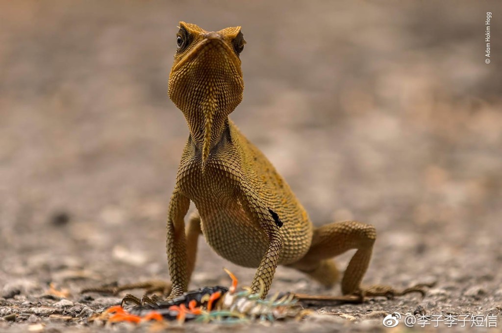 1,一只刚刚战胜了剧毒蜈蚣并踩在脚下的得意洋洋的天虎角树蜥蜴。