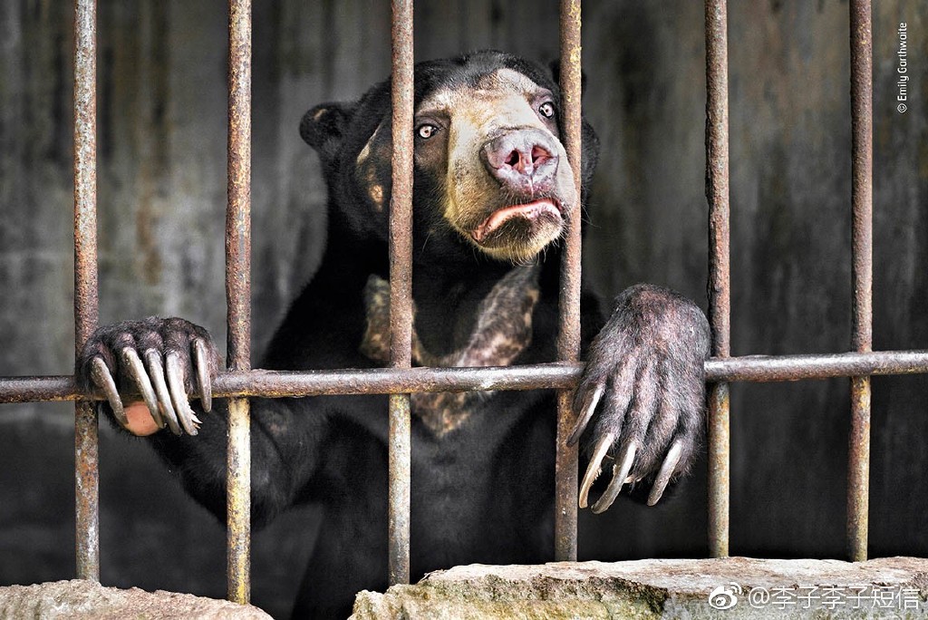 6,苏门答腊岛上,一个设施堪忧的动物园里的马来熊。摄影师 Emily Garthwaite 路过的时候,马来熊开始向他求救一般呼喊。