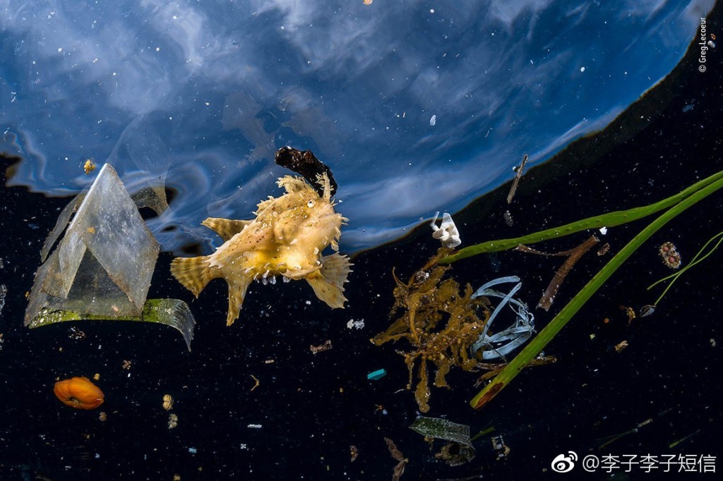 5,印度尼西亚浅海,裸躄鱼和周围漂浮在海里的垃圾。