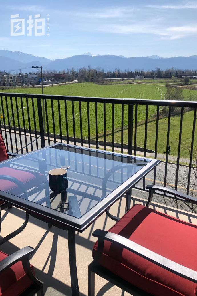 我家的阳台,可以看到外面的草坪和远处山上的积雪。