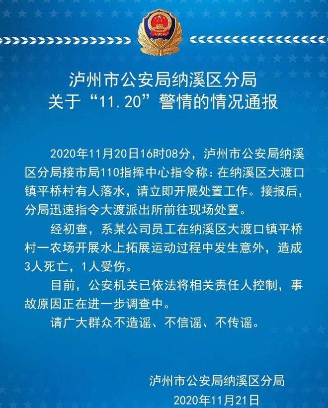 21日,四川泸州市公安局纳溪区分局发布通报:11月20日16时8分,泸州市公安局纳溪区分局接市局110指挥中心指令称,在纳溪区大渡口镇平桥村有人落水。经初查,系某公司员工在纳溪区大渡口镇平桥村一农场开展水上拓展运动过程中发生意外,造成3人死亡,1人受伤。目前,公安机关已依法将相关责任人控制,事故原因正在进一步调查中。