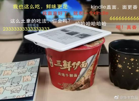 甚至连亚马逊官方也拿“泡面盖”作为 kindle 最新版的卖点宣传起来,打出了 “盖 kindle ,面更香” 的宣传语。