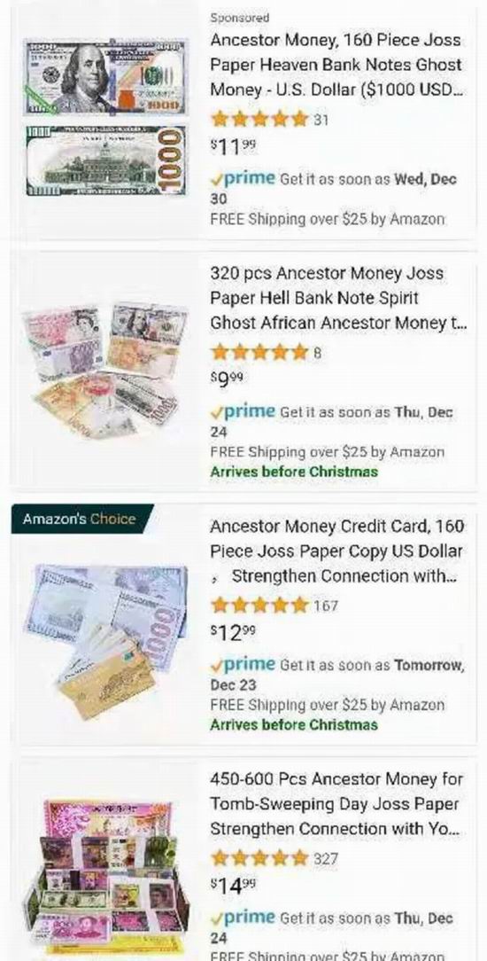 有朋友最近给我发来一张图,说国内的“冥币”文化在国外火了: