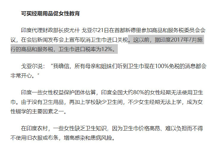 首先印度那12%是进口关税。印度本国造不出廉价的卫生巾,为了保护本国的产业,所以对外来的卫生巾征收关税。在舆论压力轰炸下取消,当然他们本国的卫生巾并没有便宜,因为商家从来不存在减税就降价的说法。印度用得起卫生巾的女性多数收入阶层较高,她们对卫生巾的支付意愿在宣传下提升之后,涨价才是硬道理。