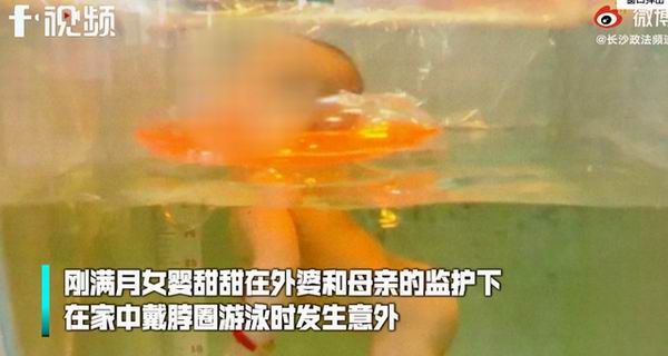 近日,湖南一名刚满月的女婴在外婆和母亲的监护下在家中戴脖圈游泳。女婴父亲回家时发现孩子脸色苍白、不哭不动,家人这才觉察异常。然而因缺氧时间过长,女婴最终不幸离世。医生提醒:婴幼儿佩戴脖圈游泳存在众多不安全因素,需在专业人员陪同下进行。
