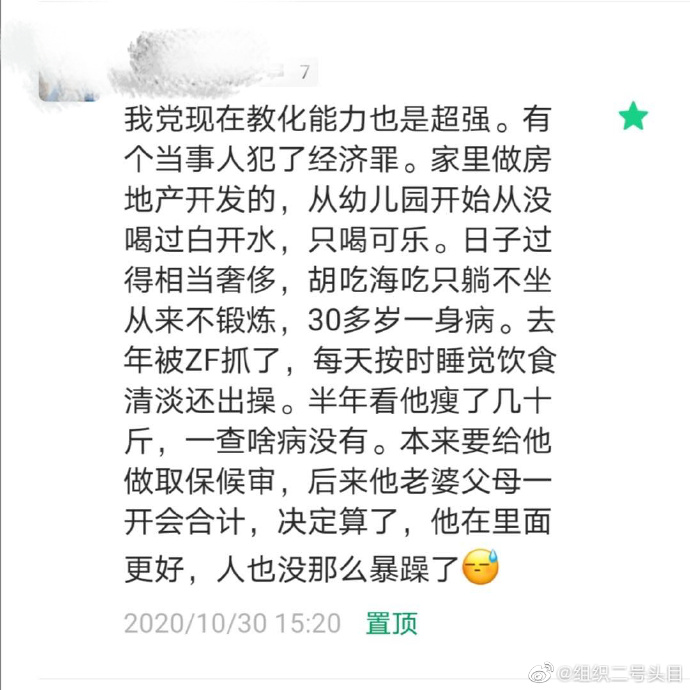 @明德惟馨417:昌平那个监狱大家都知道吧 这群大官们自从进去了 饮食作息规律还锻炼 不喝酒不抽烟的 原来的什么三高啊什么病啊 都没了 据说还有人在里面难得说有大块空闲时间 可以写很多东西 反正大家都是很有才华的人