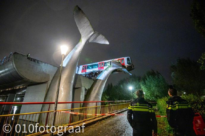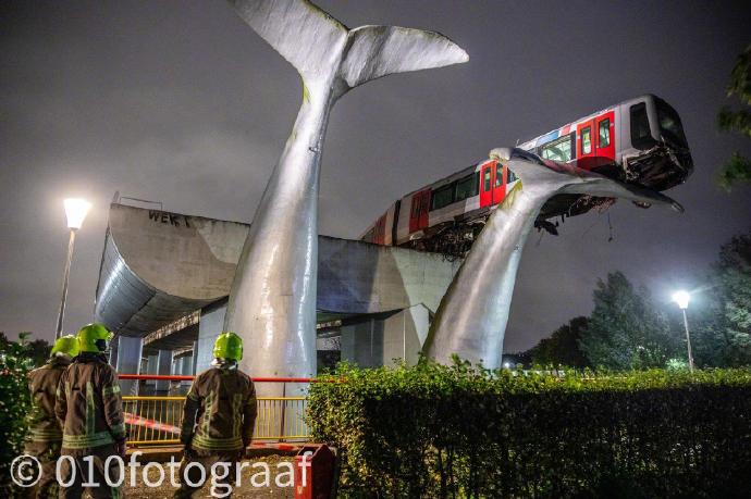 荷兰斯派克尼瑟的一辆轻轨冲出了轨道末端缓冲带,结果被一座鲸鱼雕塑给接住了…连做成雕像都能救命,鲸真是太感人了