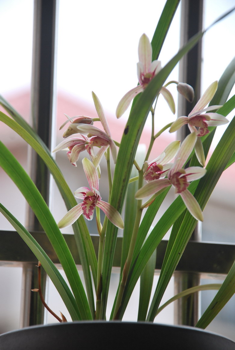 早年最高纪录时曾养了45盆兰花,但由于没有技术,而且太多实在难以照料,结果全军覆没。其中还有几盆名贵品种,很可惜。如今这些是前年春节从容县带回的。这盆去年和今年都开花,看来有些特别。现在我的体会是在家庭养兰10盆左右较适宜,容易照料。不求多,除非你是专业人士——或者是花痴!