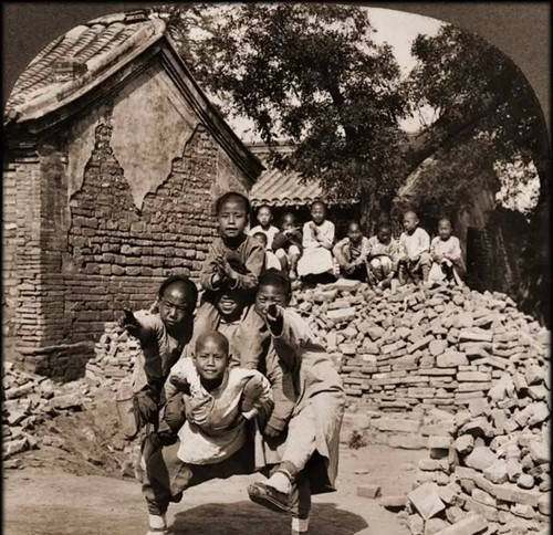流浪孩子组成的杂耍班在表演龙头的造型北京1902