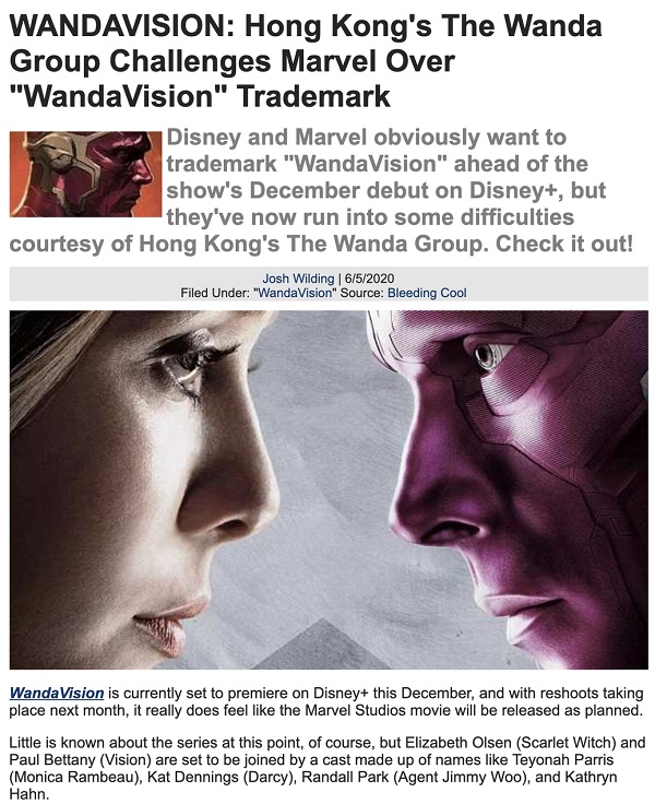 中国香港万达集团表示在多年前就已注册Wanda商标,因此对漫威新剧《旺达与幻视》(WandaVision)的商标提出异议!