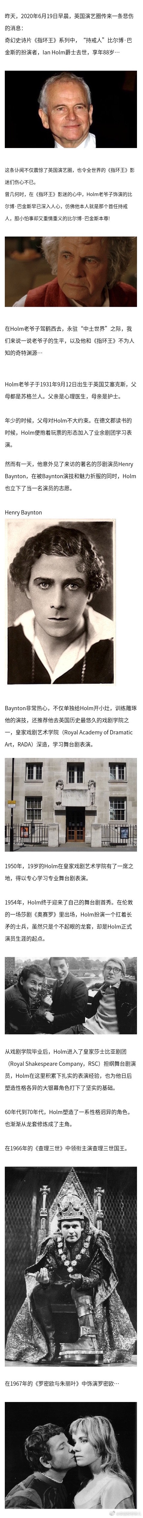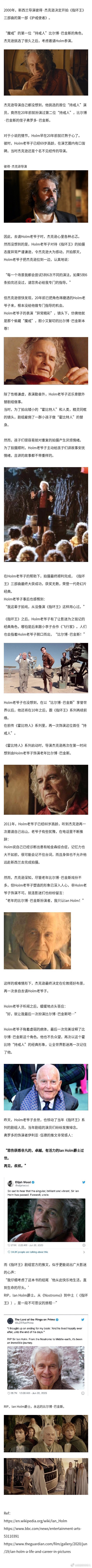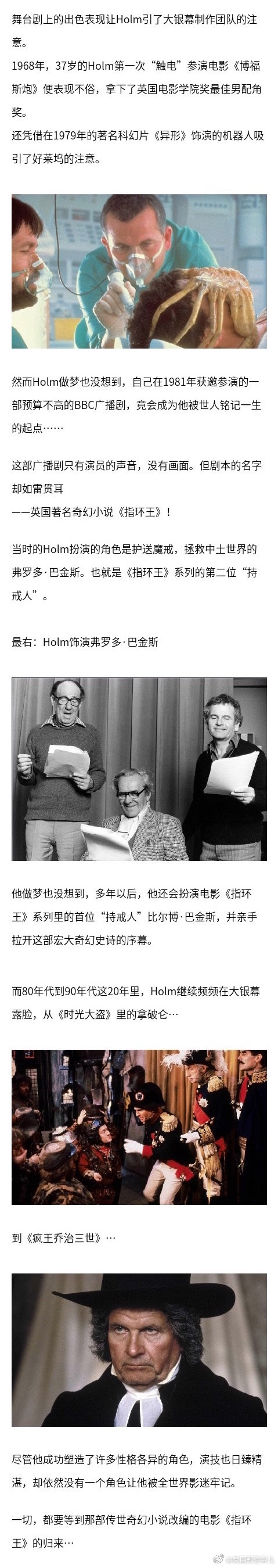 “持戒人”比尔博·巴金斯的扮演者Ian Holm去世。回首他这一生,没想到Holm老爷子,跟这奇幻史诗《指环王》竟有这么深的渊源…