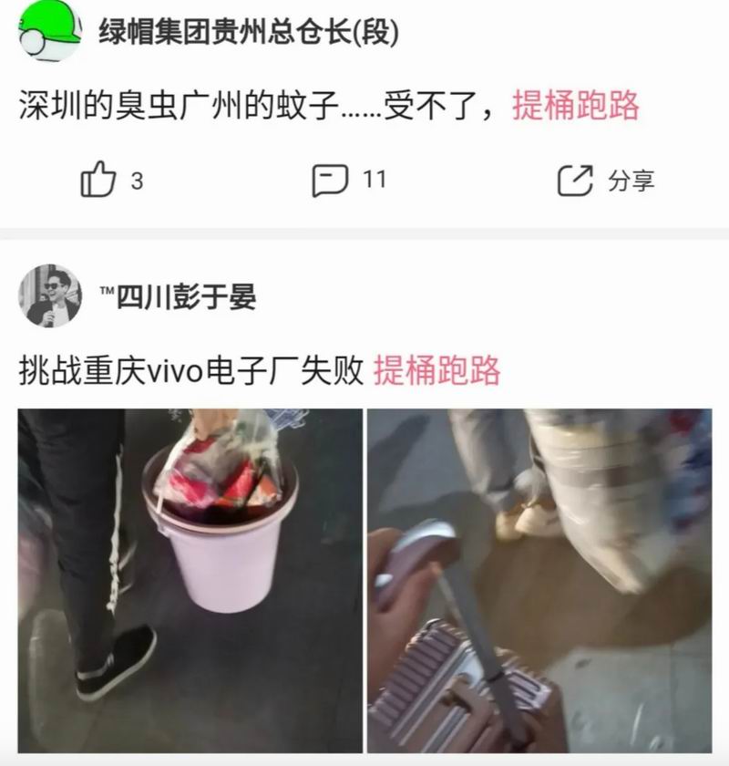 电子厂可以换成维修厂、工地等,不变的是结局一定是"提桶跑路"。这些视频拍摄者有真的电子厂挑战失败的年轻人,也有不少攫取流量的模仿者,在这波短视频的风潮下,"提桶跑路"已经成为当下无数打工仔的时代画像。