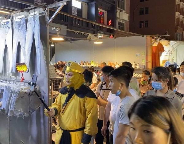 义乌宾王夜市上,扮成孙悟空直播的年轻人