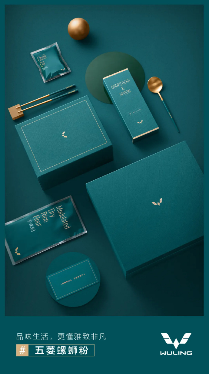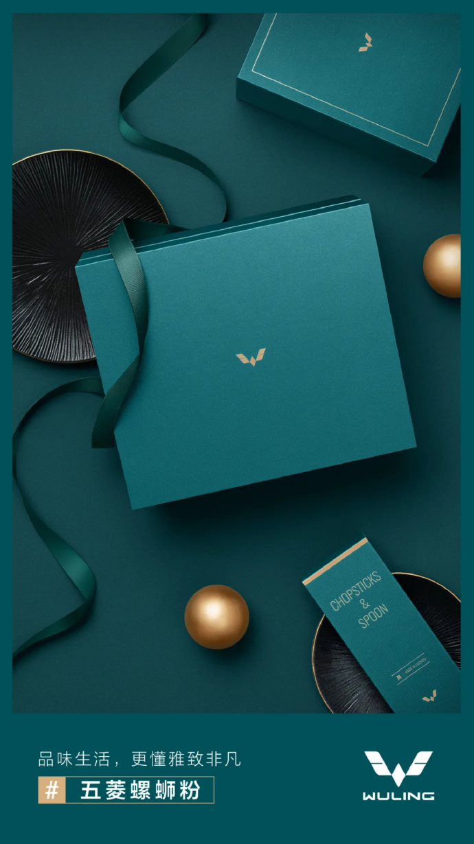 区别于普通袋装螺蛳粉,本次推出的五菱牌限量版螺蛳粉,采用高贵典雅的祖母绿作为外观主色,内置除螺蛳粉外,还贴心配备了精美餐具套装。