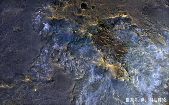 2019年2月15日传回的这张图,则让我们领略了来自火星地壳不同深度不同位置的基岩面貌,中央高高突出的那块绿色基岩碎片则有可能来自地表以下数公里处的火星内部。