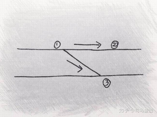 (如下图,1.到.2.就是定位,1.到.3.就是反位,而列车在.1.位置,到底走.2.还是走.3,就要看.1.号位这里道岔怎么扳了,其行为本身是背后的车辆段信号联锁系统在控制着)。