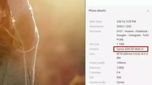 然而,这张堪比单反的照片,真的就是单反拍的,还是佳能5D Mark III这样的全画幅专业单反搭配70-200mm专业镜头(爱死小白兔)。凭这样的组合,按说怎么也模拟不成手机摄像头的效果,并且华为居然将没有抹掉Exif的照片直接放了出来。#一位临时工走了过去#