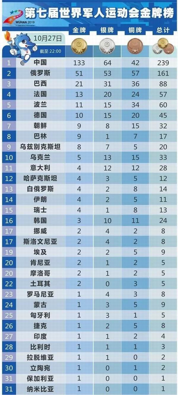 然而,令人惊诧的是,军运会奖牌排行榜,中国排名第一,夺得了138块金牌,俄罗斯排行老二。恐怕打死你也不相信,美国的排名竟然是38名,美军派来300多人的军事精英,竟然连一枚金牌也没有夺得。