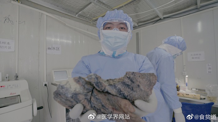 @医学界网站:这是#重症新冠患者的肺# ,已经完全失去活性,纤维化了。所以会造成人呼吸困难,血氧含量降低,最后死亡。肺部的黑点,是这位死者抽烟导致的结果。也要感恩大体老师,谢谢你们的奉献