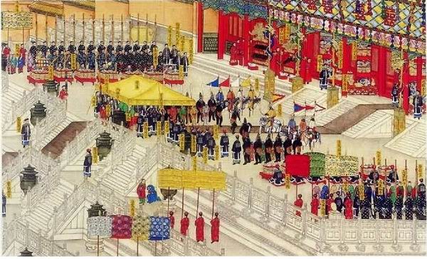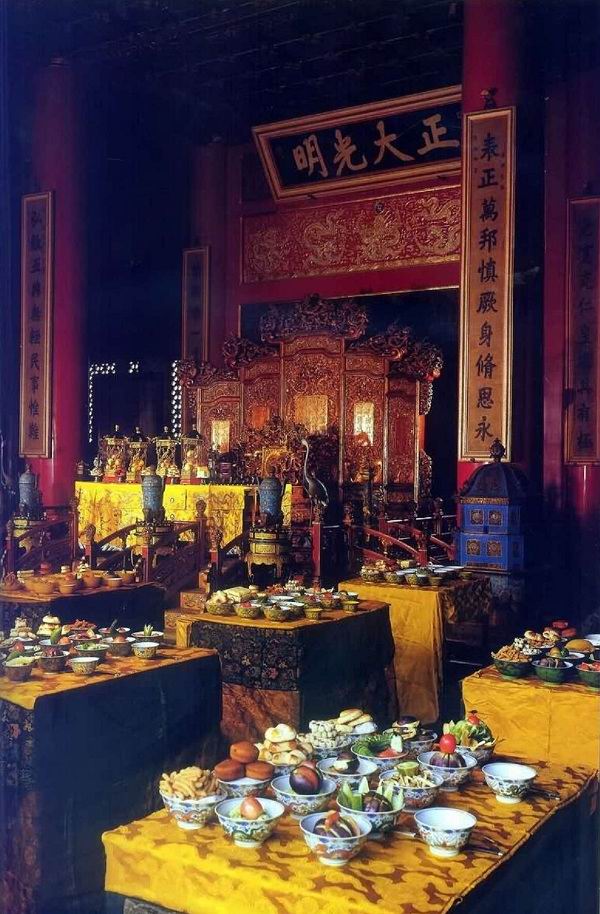 紫禁城处于北京城的中心,太和殿位于紫禁城的中心,可以说是整个帝国的中心所在,是皇权一统的象征。故而清代的重大庆典,如皇帝登基、庆寿、结婚、出征以及元旦(古时称春节为元旦)、冬至等重大节日,多在太和殿举行宴席。皇帝的家宴,一般放在乾清官,外朝廷宴则放在太和殿。