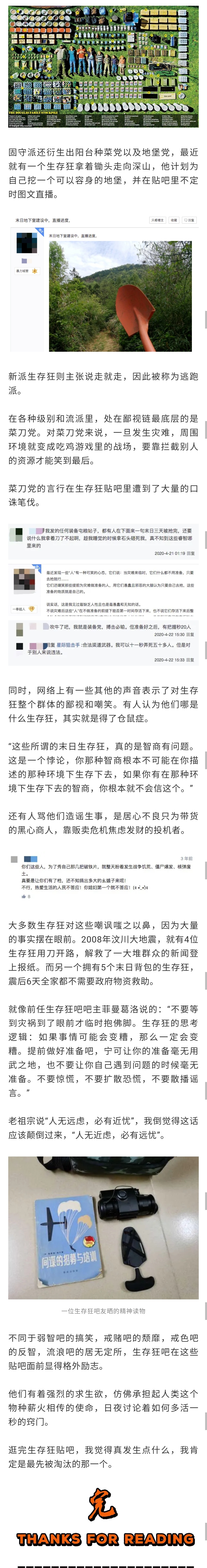 当大多数人不得不为采购食物和生活用品而冒着生命危险出门时,他们却可以在家里靠两年前囤积的压缩饼干和罐头闭门不出,顺便再到他们的线上大本营百度生存狂贴吧发帖报个平安。via
