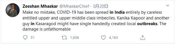 印度知识分子们是这么看待这个问题的。他们觉得印度上层社会的人觉得印度不安全,跑英国和美国躲着去了(我们前文讲了,印度上层是说英语的,和欧美关系千丝万缕);后来发现那俩国要搞自然免疫,躲不下去了,又跑回了印度,把病毒给带回去了。这也就解释了为啥疫情在印度上层开始流行。