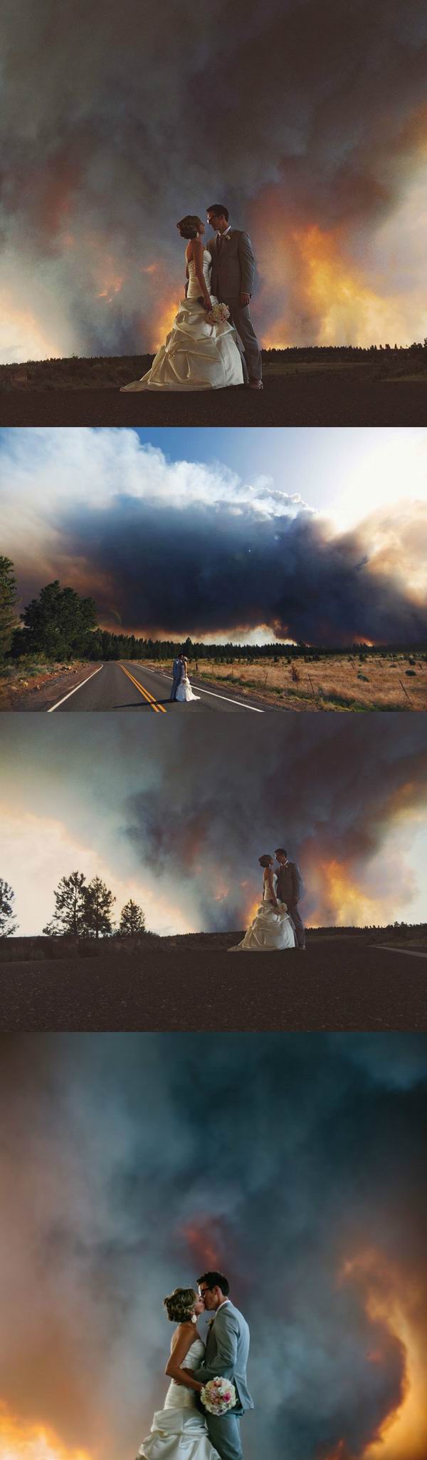 美国俄勒冈市一对新人结婚时发现婚礼地点附近的森林起了大火,无奈之下只好更改地点,但是在宾客疏散的时候,他们还是抓紧时间在这个已经期盼了很久的地方拍了几张照片,结果拍出了相当壮丽的婚礼照片。