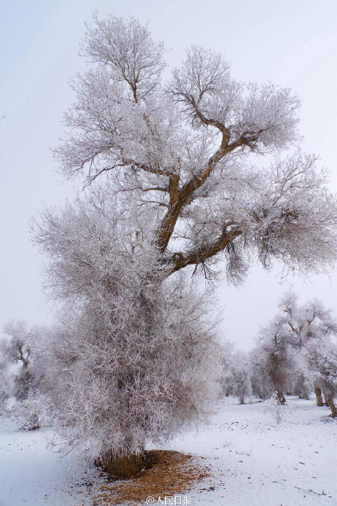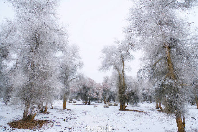 新疆阿克苏,库车县塔里木乡昆阿恰克村,大雪飞舞。雪歇后,雾气沉沉,千树万树梨花开,胡杨林银装素裹,婀娜多姿,美得让人窒息,仿佛置身《冰雪奇缘》仙境一般。你想去看吗?