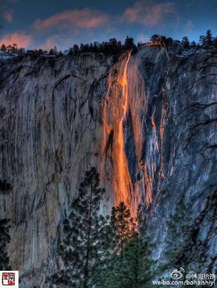 美国加州优山美地(Yosemite)國家公園里那块900米高的巨石(El Capitan)頂上有一條小瀑布叫馬尾瀑布(horsetail fall)。在每年二月下旬,如果有足够的雪,合适的阳光和温度,下午就会有瀑布出现。太陽下山前光線正好被El Capitan擋著﹐只照到瀑布,照不到岩石,這樣就形成了一條紅色火龙