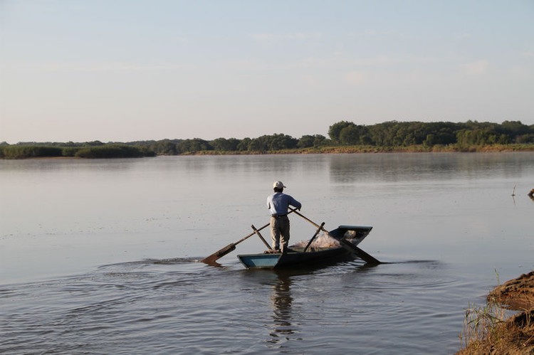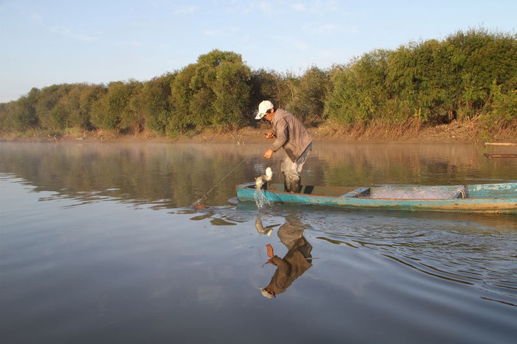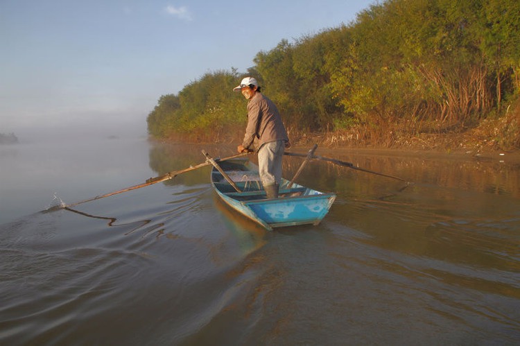 我们继续前行。我拿相机坐船头,海军大哥划船走......