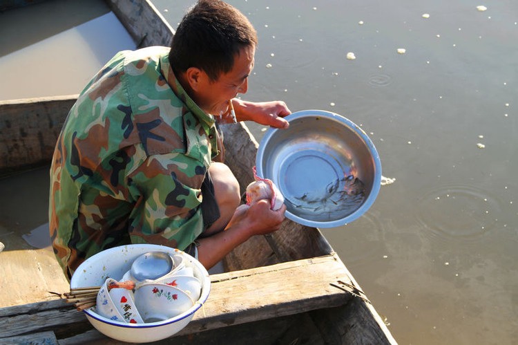 碗一下去,鱼儿纷纷过来与人亲密。其实它们是来抢这剩饭残余。后来