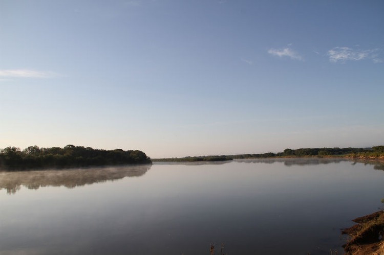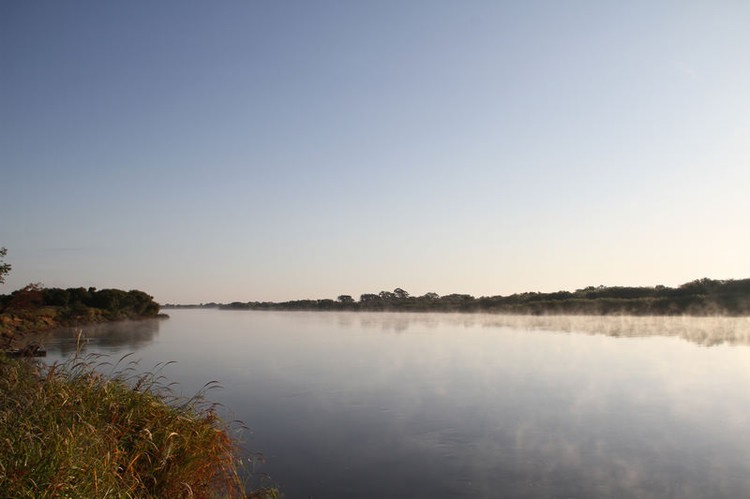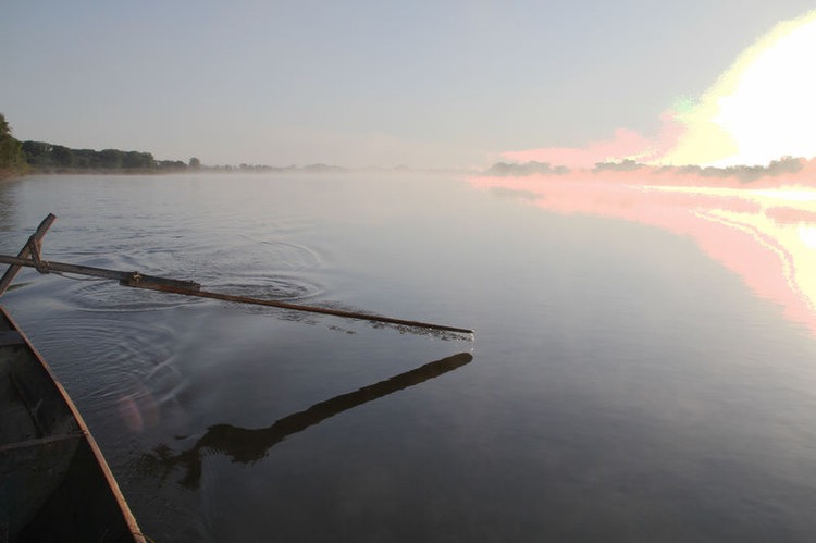 晨雾渐渐散去,升起的太阳把江面映照的像镜子一样。