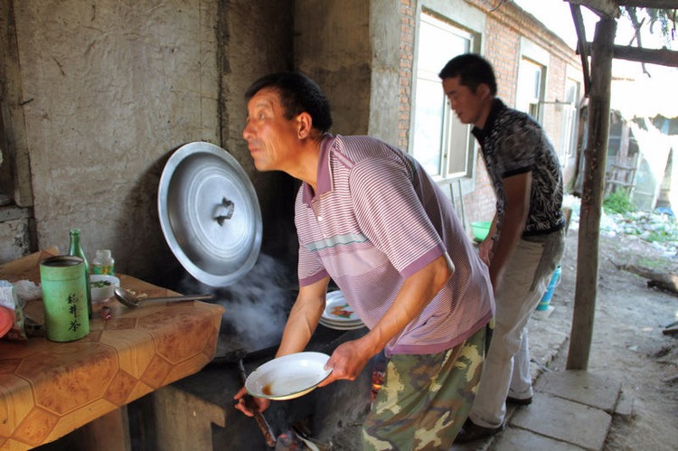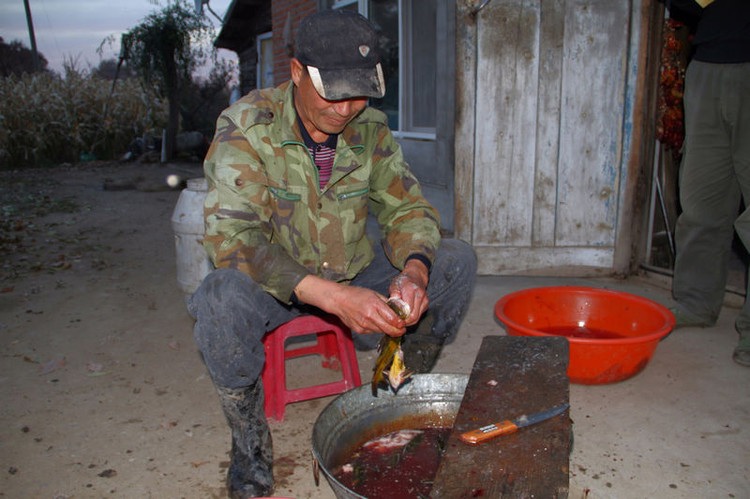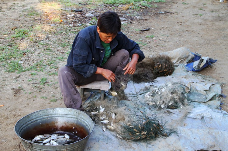 天快黑了大哥外出办事才回来,又有一桌客人要来,便忙去屋后的池塘里捞鱼。