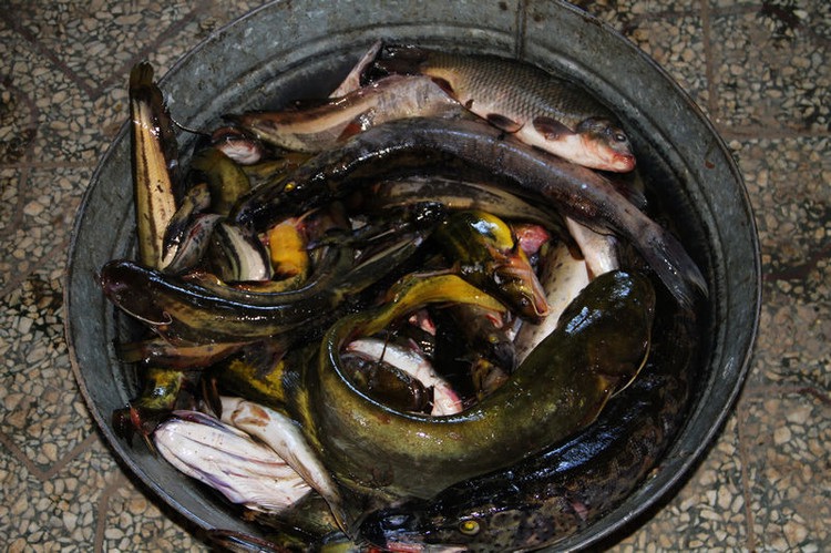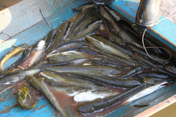他下的夜钩已经收获了这么多的鲶鱼,今天的收获真是不少。