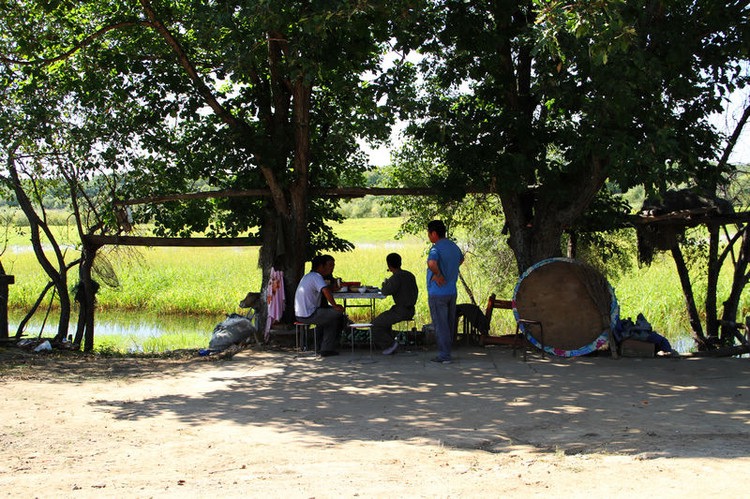 粗大柞树遮阴凉,再往前几米就是大湿地,屋后大榆树下就是一个大鱼塘,甘