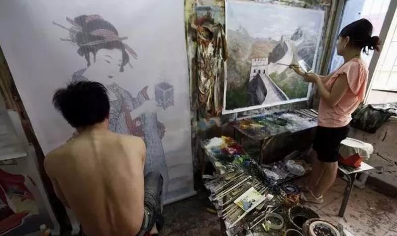 "一张大幅的高仿油画在欧洲可以卖到一千多欧元,然而画工也就赚几百元人民币。"