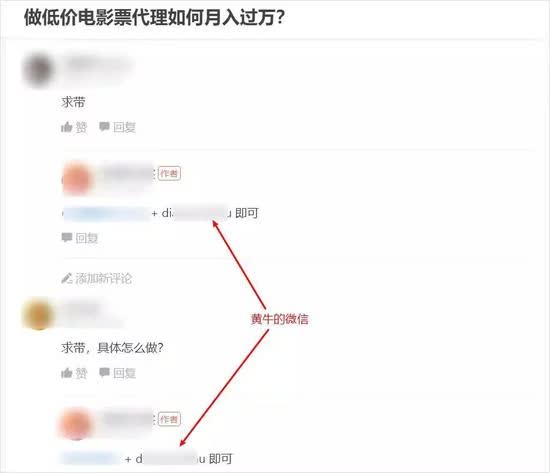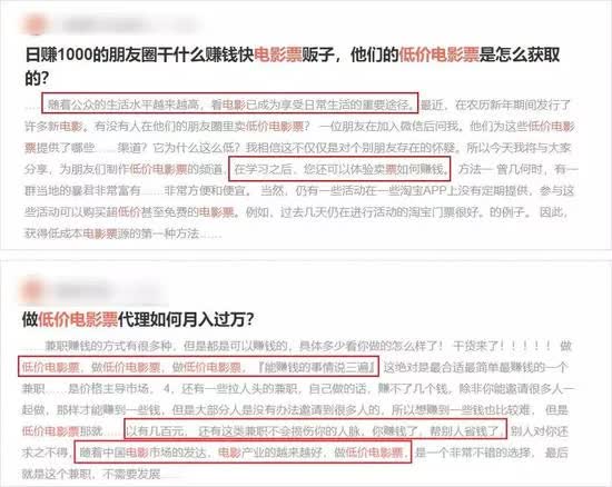 现在,电影票黄牛最常见的引流手段,就是在知乎、贴吧等大流量网站以及简书、头条号等自媒体平台上发布“揭秘”类的软文,靠着“副业赚钱、月入过万”等噱头吸引用户。